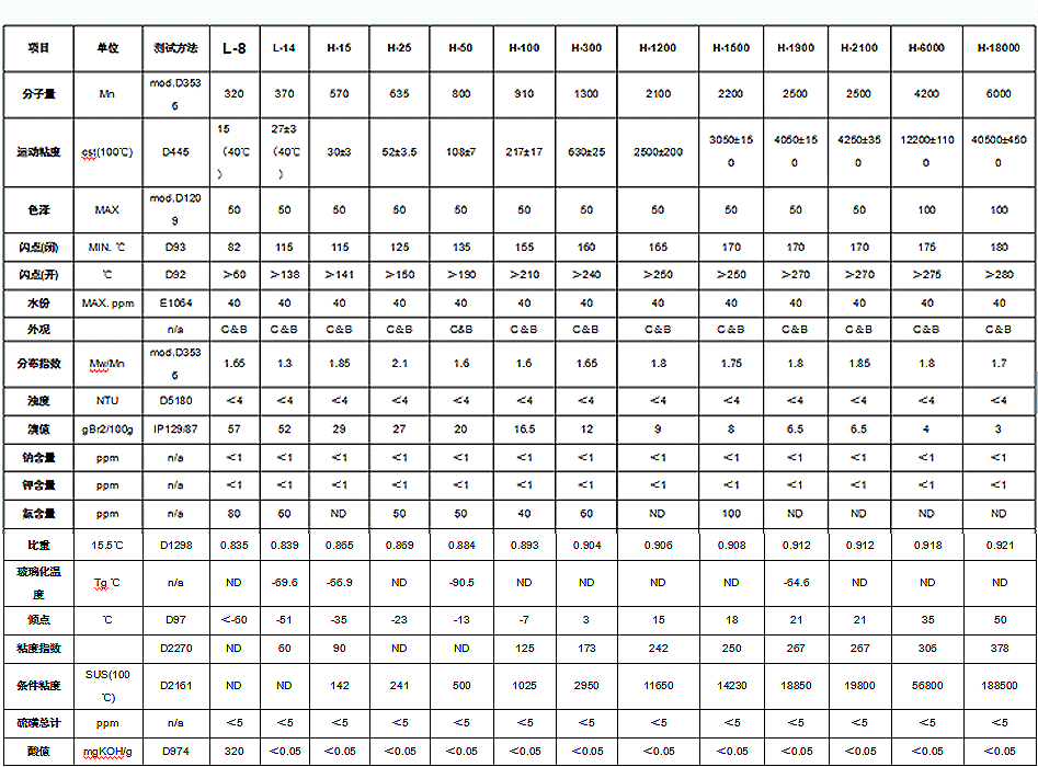 ,牌號多、氯含量低、高溫下無殘炭、分布指數小等優點,使其廣泛應用于工業潤滑油及車用油領域。優良的氧化安定性和增粘效果,可改善潤滑油的潤滑性能。